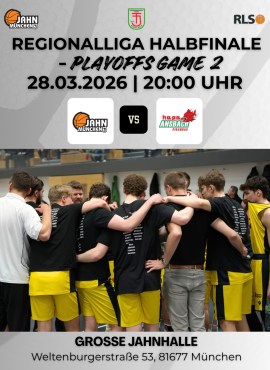 27.03 27.03.2026 13:15 von Armin Sperber Halbfinale, Spiel 2 zuhause Die Gäste mit dem Rücken zur Wand, wahrscheinlich doppelt motiviert - unsere Jahnler wollen nach dem 90:79 auswärts furios ins Finale einziehen(Vorspiel um 17:30: Regio2-Aufsteiger H2 gegen Sonthofen) mehr