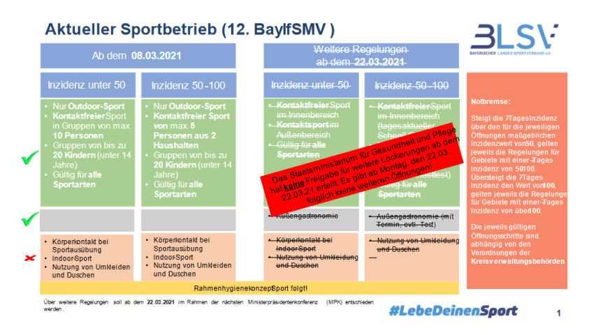 In Bayern gilt seit dieser Woche die zwölfte Infektionsschutzmaßnahmenverordnung, in der es erstmals seit November auch wieder Änderungen in Bezug auf den Sportbetrieb zu lesen gibt. Seit 08.03. ist das Verbot des Betreibens von Sportanlagen unter freiem Himmel aufgehoben. Unabhängig von der Inzidenz. Das heißt für unser Vereinsgelände zwar erstmal nichts, weil unsere Außenanlage gerade eine Baustelle ist, wohl aber für unsere Mitglieder: Individualsport auf den bayerischen Freiplätzen ist dadurch erlaubt. Konkret wären das zum Beispiel Shooten im Maßmann-Park mit Silver oder Sprungkrafttraining mit Schwester, Mama, Papa und Hausfreund auf dem Jasberg (maximal 5 Personen aus maximal 2 Haushalten).