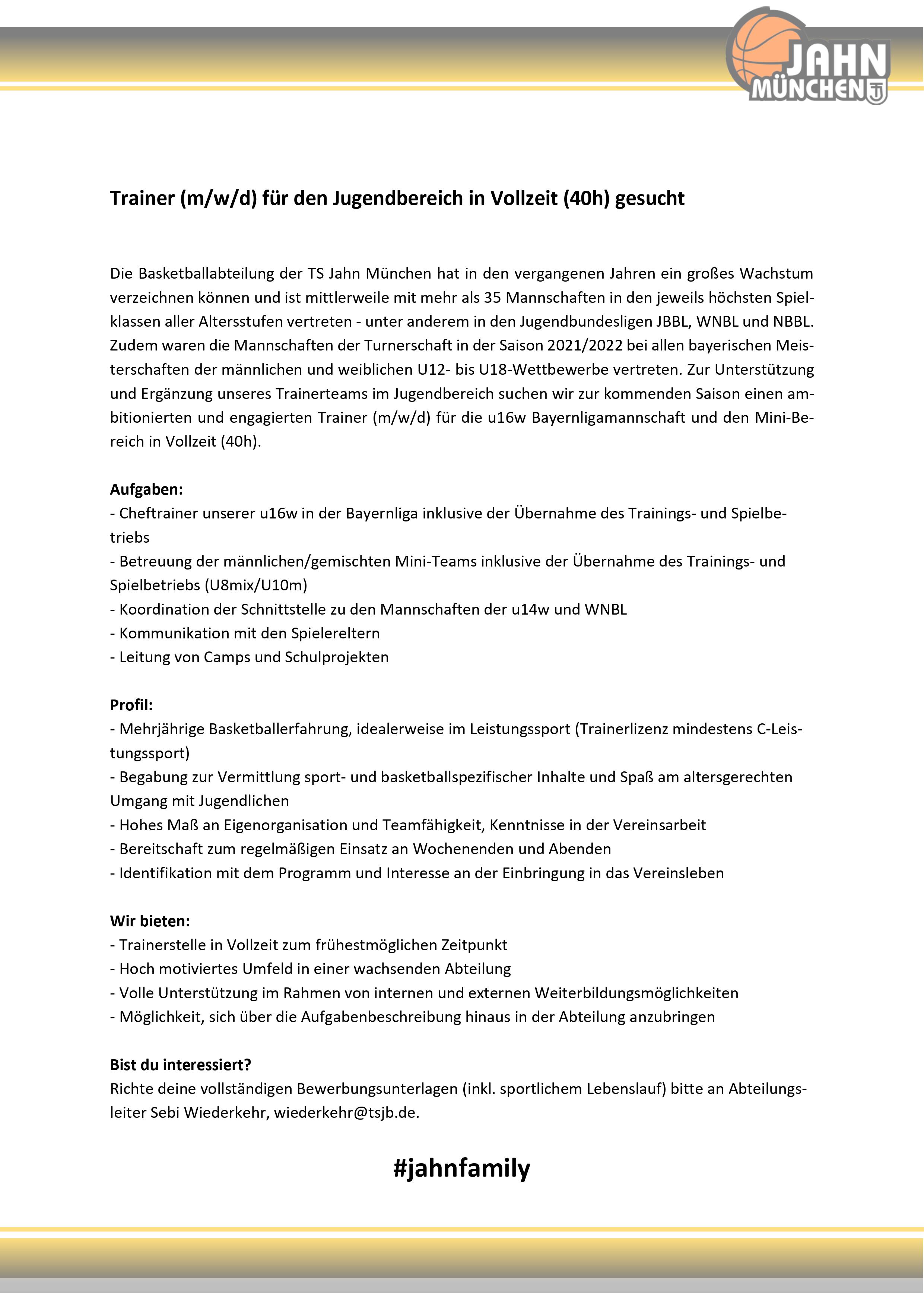 Die Turnerschaft Jahn München sucht für die kommende Saison Unterstützung für das Trainerteam im Jugendbereich. Bieten können wir uns sowohl eine Beschäftigung in Vollzeit (40h), als auch eine geringfügigen Beschäftigung im weiblichen Bereich zum nächstmöglichen Zeitpunkt. Interessenten für die folgenden Stellen können sich gerne bei Abteilungsleiter Sebi Wiederkehr unter wiederkehr@tsjb.de melden: