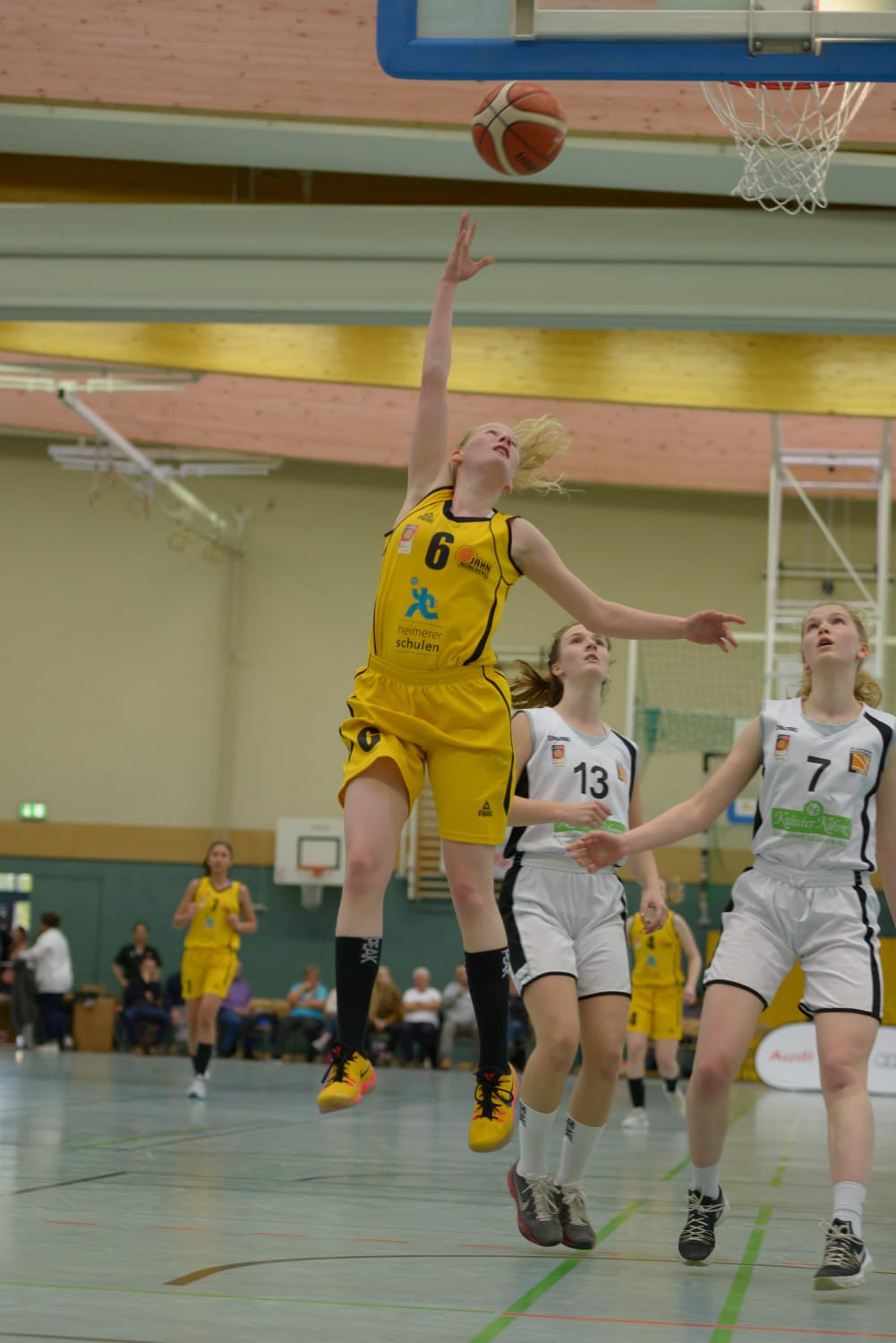 Das Team stimmte sich ein. Man hatte das Momentum auf seiner Seite und wollte vor allem zeigen, dass das Team mit ihrer engagierteren Mann-Verteidigung verdient hat, das Spiel für sich zu entscheiden. Den besseren Start erwischten die Gäste und gingen zunächst in Führung. Eine Minute vor Schluss waren es beim Stand von 54:58 sogar minus vier Punkte aus Sicht der Heimmannschaft. Dann schlug die Stunde von Toni Bieringer! Sie hatte sich so viel vorgenommen für das Spiel, aber die Würfe wollten über die reguläre Spielzeit einfach nicht fallen, aber DIESER schon! Nachdem sie ein paar Sekunden davor schon zum Ausgleich per Lay-up verwandelte, traf sie im darauffolgenden Angriff von ganz weit. Ganz unten von der Baseline sprintete sie hoch, bekam den Ball an der Birne und PUMM - THREEEEE Pointer Toni Bieringer und die 61:58 Führung wenige Sekunden vor Schluss. Diese gab die TS Jahn nicht mehr her und holte sich die Verlängerung mit 12:8 Punkten und so den Sieg im Top Spiel (Endstand 61:58).