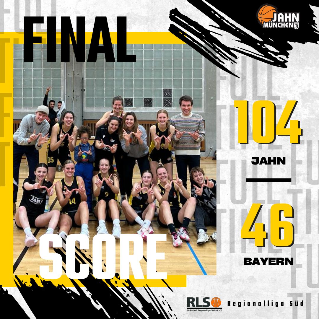 Erfolgreich verlaufen ist der aufgrund anhaltenden Schneemassen auch innerstädtisch durchaus noch herausfordernde Trip an die Säbener Straße für Jahns Regionalliga Damen. Beim FC Bayern Basketball setzen sich die Schwarz-Gelben am späten Sonntag-Nachmittag schlussendlich mit 104 – 46 durch.