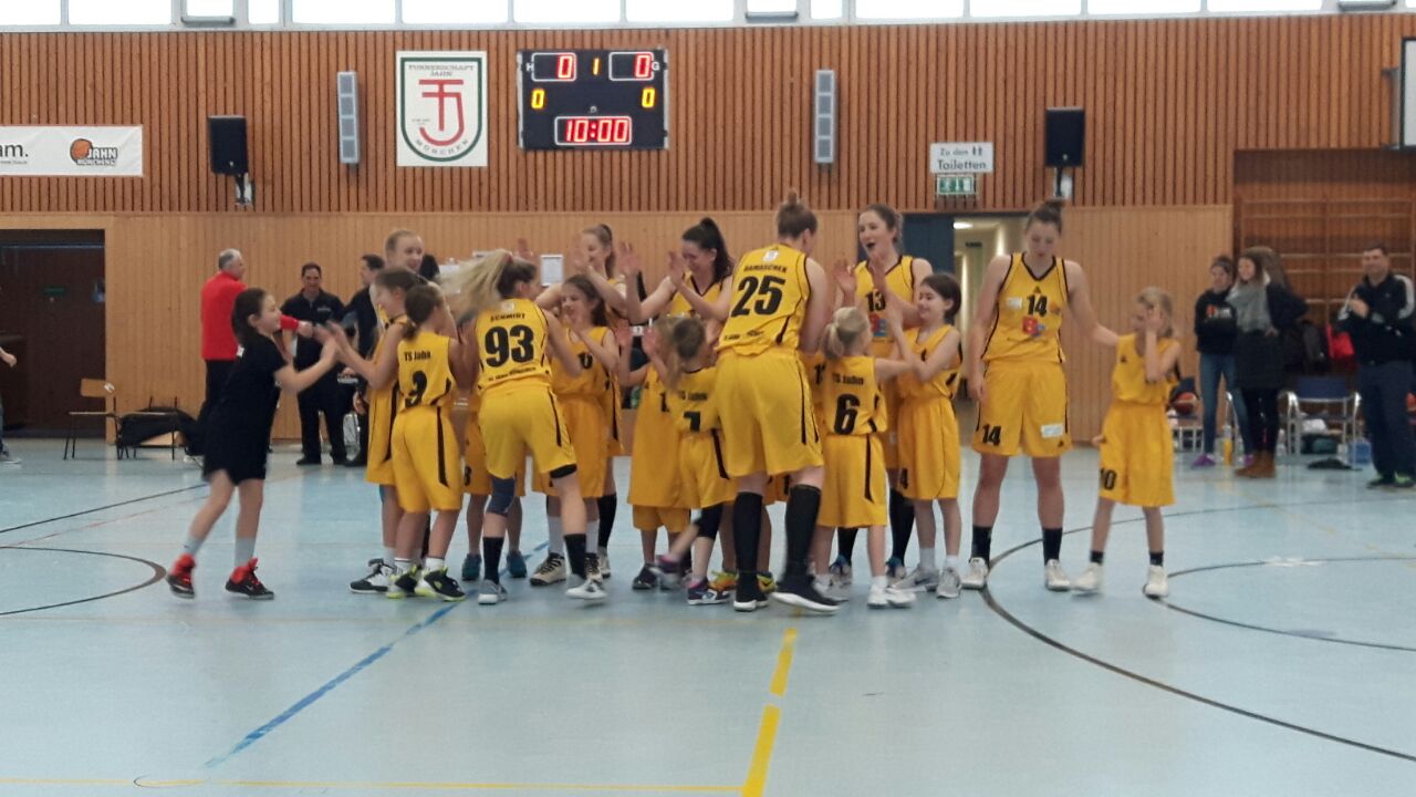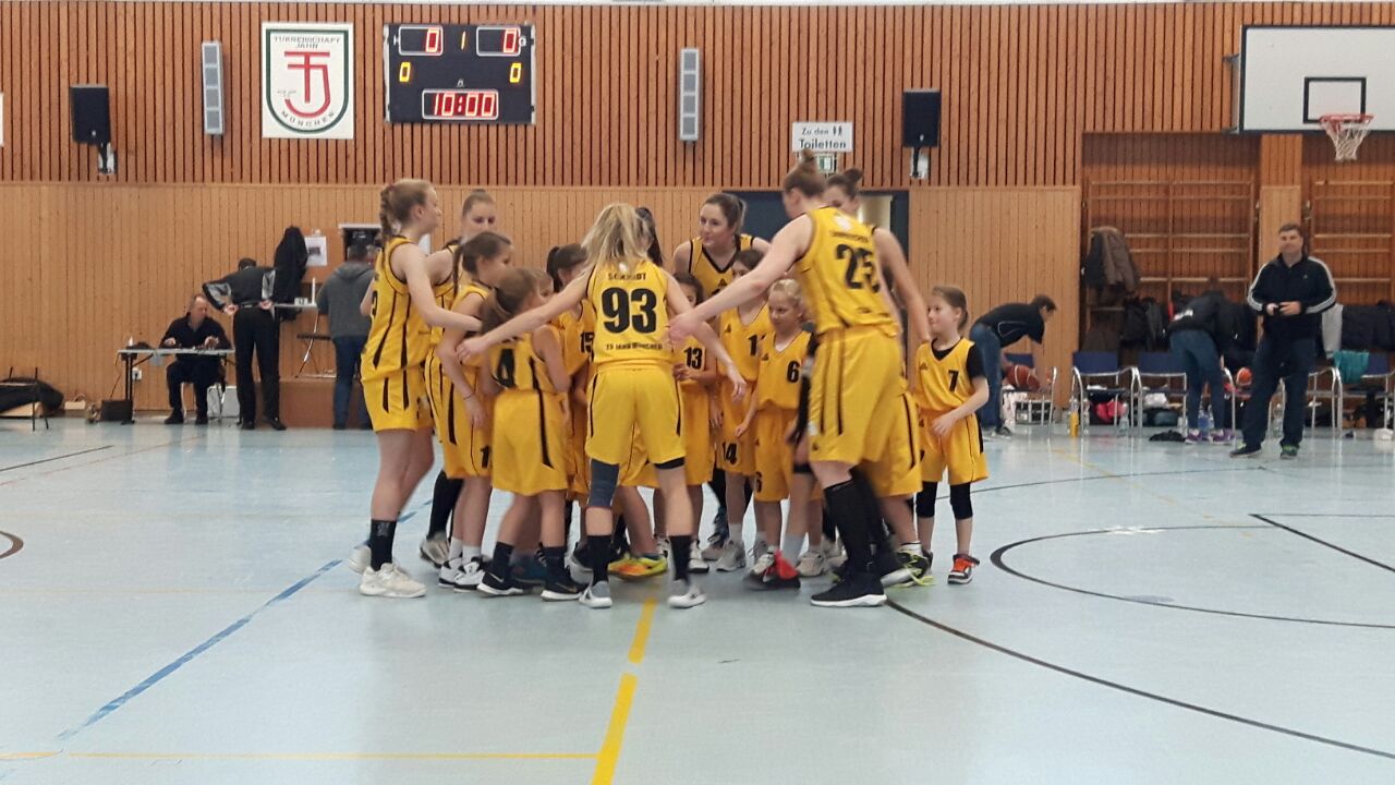 Mit zwei großen Trommeln bewaffnet machte das Team dann ordentlich Stimmung in der ersten Halbzeit, die das DBBL2 Team des Jahn noch durchaus ausgeglichen gestalten konnte. Zur Halbzeit durften unsere Minis dann ein kleines Demospiel machen, solange die DBBL Teams zur Besprechung in der Kabine verschwanden. Die kleinen Damen spielten munter auf und ließen sich von den ca. 100 Zuschauer nicht beeindrucken. In der zweiten Halbzeit mußte das Damenteam dann aber dem hohen Tempo in den ersten 20min Tribut zollen und der Gegner aus Herne baute die Führung konsequent aus. Das Pokalspiel ging verloren, aber unser jüngster Nachwuchs hat sich an diesem Sonntag toll präsentiert!