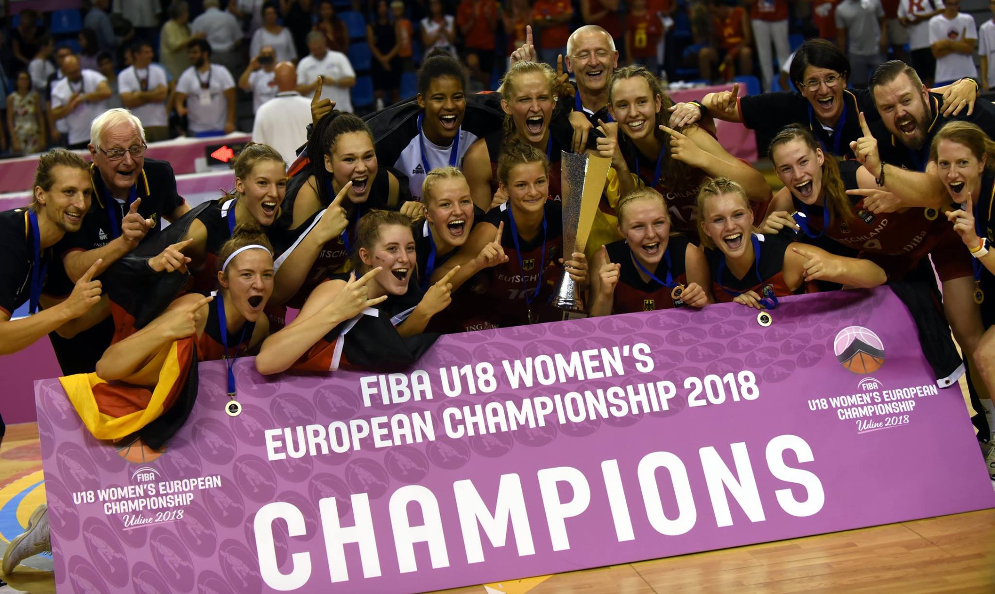 Im Sommer hieß es wieder für Emmy und Leo das Nationalmannschaftstrikot überzustreifen. Wieder EM (hier mit dem Bericht des DBB). Wieder in Udine. Wieder mittendrin: Emmy und Leo. Nach einer wackeligen Vorrunde und einer Niederlage gegen Ungarn fand sich das Team mit späterem All Star Leo und „unsung Hero“ Emmy. Das Team zeigte sich nach anfänglichen Unstimmigkeiten auf dem Feld souverän in den K.O.-Spielen. Nach dem Viertelfinale war klar: Nächstes Jahr ist Deutschland für die U19 WM qualifiziert! Im Halbfinale gegen Lettland schien das Team wie beflügelt zu sein. Der Druck schien sichtbar weniger zu werden, da nun die WM erreicht war. Der Unterschied zwischen dem ersten Vorrundenspiel (mit Lettland, Ungarn und Deutschland kamen 3 der 4 Halbfinalteams aus einer Vorrundengruppe!) und dem Spiel um Einzug ins Finale war deutlich zu erkennen. Das Team spielte wie ausgewechselt und ließ den Lettinnen keine Chance. Am Ende? Wieder eine ähnliche Situation wie vor zwei Jahren damals in der U16: Wieder Finale. Gegen Spanien. In Udine.