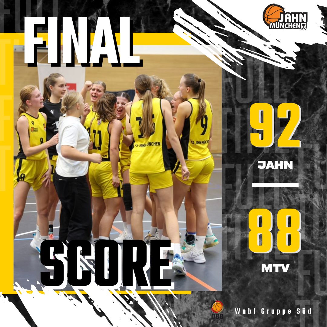 Zum Ende eines spannungsgeladenen Derbys behauptet der Jahn am frühen Sonntag-Nachmittag seinen ersten Punktspiel-Erfolg auf dem WNBL-Parkett. Im Duell mit dem MTV München 1879 setzen sich die Hausherrinnen vor gut gefüllter Kulisse an der Weltenburger Str. schließlich mit 92 – 88 durch. Somit stehen Jahns U18-Korbjägerinnen vor der ersten kurzen Herbst-Verschnaufpause bei einer ausgeglichenen Bilanz von einem Sieg sowie am Vorwochenende einer Niederlage in Stuttgart.